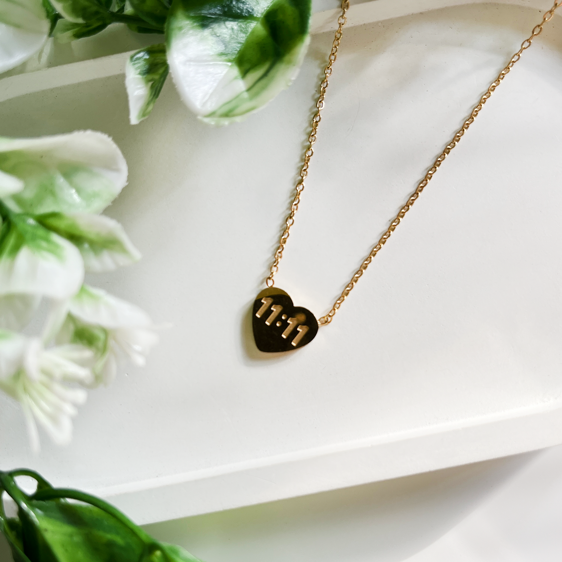 Elevate your style and express your unique sentiment with the trendy 11:11 Heart Necklace, adorned with a symbolic touch of elegance. The heart pendant is delicately engraved with the meaningful number "11:11," known for its significance in the realms of intuition, spiritual awakening, and synchronicity. This enchanting detail adds a layer of personal significance, making it not just a piece of jewelry but a cherished symbol of guidance and connection.
