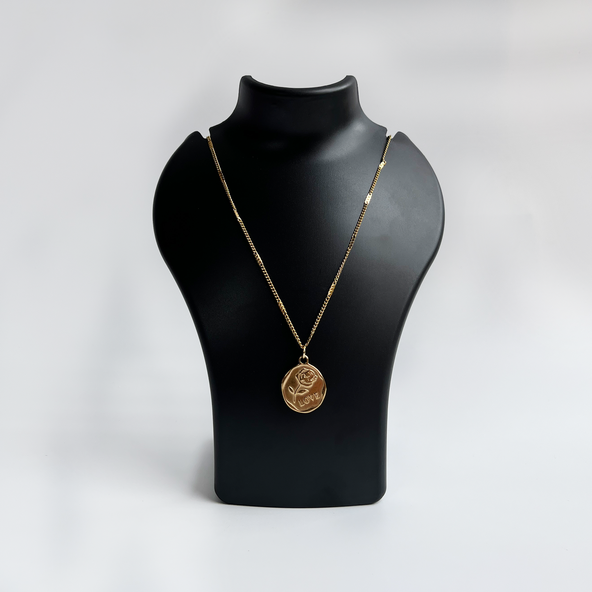 Celebrate love with the stunning Amara necklace featuring a circular pendant adorned with a delicate rose and the word "love." Crafted with intricate detail, the rose blooms gracefully against the polished surface, embodying romance and affection. Suspended from a classic gold chain, this pendant exudes timeless elegance and sentimentality, making it an ideal gift or personal keepsake.